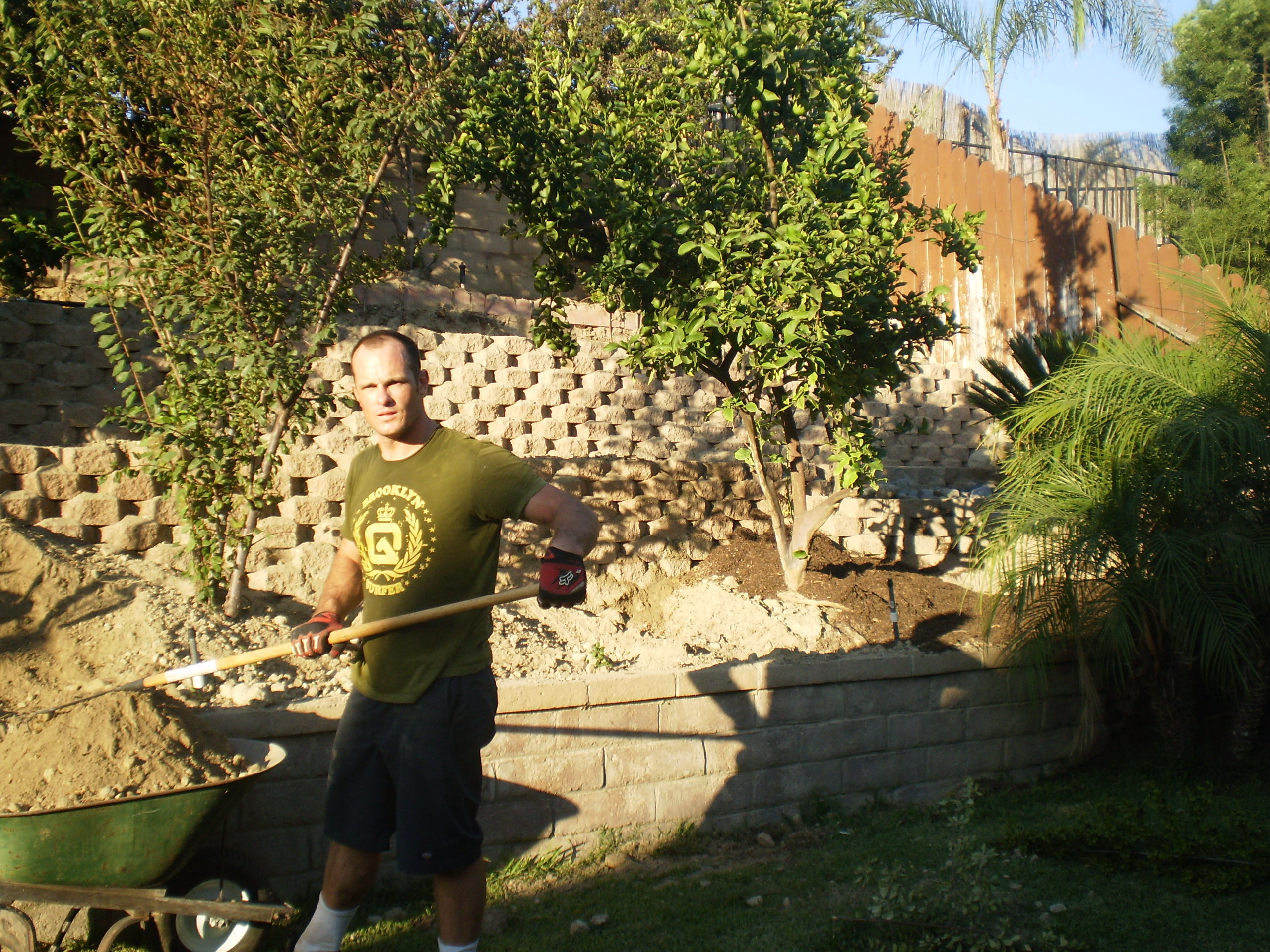 I believe the most intense training I have been up to lately would be building my backyard by myself. Lots of digging, lifting , muscle building, & sweating.  My backyard was sloped and full of weeds. What better way to save some money and work out at the same time. I started in April 2009, I ordered 8 pallets of block totaling 30,000 pounds. In order for the retaining walls to go up I needed to start digging and moving about 40,000 pounds of dirt by shovel and wheel barrel. I am learning that the human body is an amazing machine if you take care of it and train hard you can accomplish some mighty large tasks.
