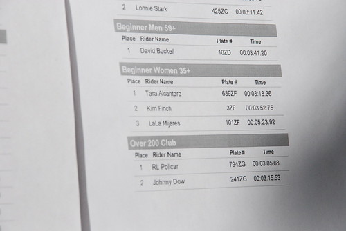 We then met up at base camp exchanging stories of our runs, then Moe ran over to see the results and came back with great news. Both of the Fabulous Finch placed, Kim was 2nd in her cat, Tony 3rd in his cat and surprisingly I came in first. I really didn’t think I would take 1st since I had such a bad crash. I was checking the video footage and I had lost about 8 seconds during that crash. But somehow I still managed to do well enough to put in a 10 second deficit against my formidable opponent, Johnny D.
